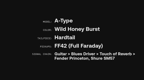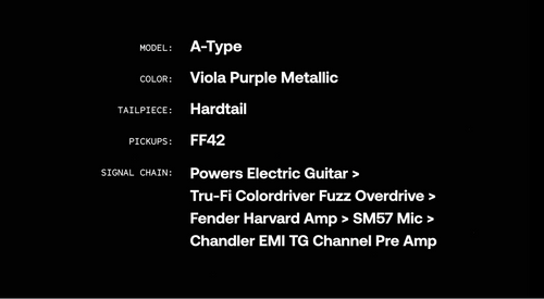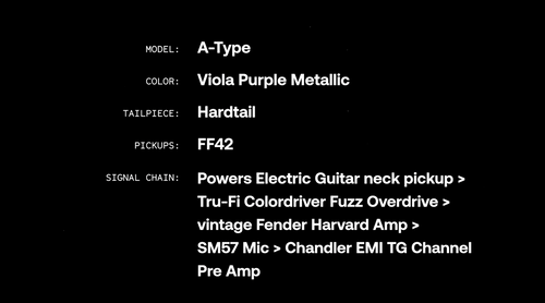 Configuration: FF42 Pickups (Bridge/Middle/Neck) / HardTail / Tru-Fi Color Colordrive Fuzz Overdrive / Fender Harvard / SM57 Mic / Chandler EMI TG Channel Pre Amp